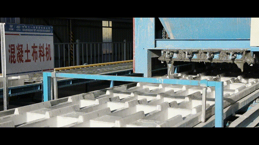 通過拌合站混凝土的輸送設備將混凝土輸送到布料機內,其作用是通過程序控制布料機的行走與滾筒線的速度同步,將混凝土送到預制構件模板內,實現均勻布料。