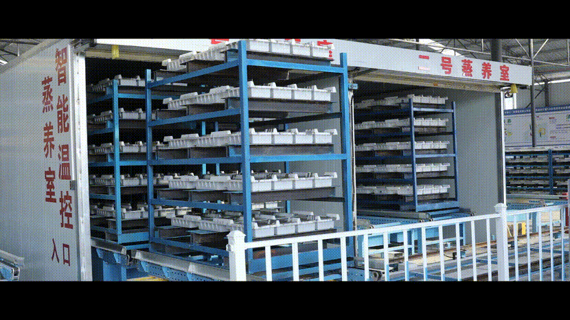 澆筑完成的混凝土托盤到達設定位置后,升降機內的伸縮貨叉伸出將托盤插起并升降,逐一將托盤放入5級貨架內,每個貨架堆滿完成后,由自動輸送線將貨架輸送至智能恒溫恒濕蒸養室養護。