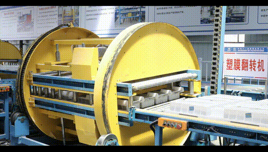 托盤模具清洗完成后,反向托盤進入自動鼠籠式翻轉機,光電對射傳感器檢測到位PLC給出指令,氣缸下壓,夾緊定位托盤,實現托盤翻轉180度。